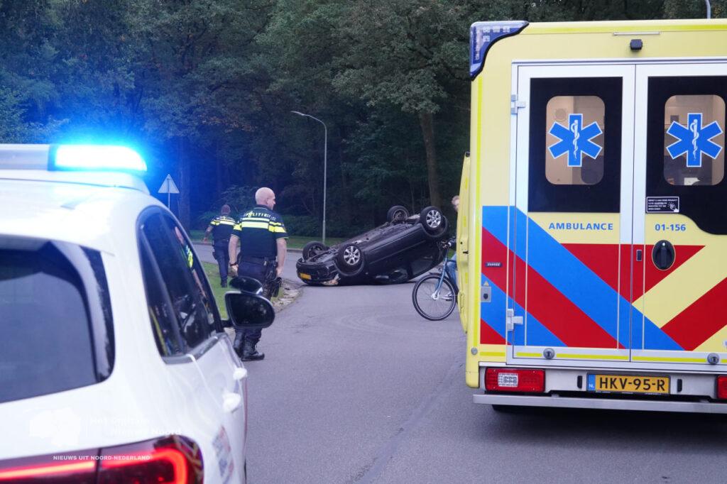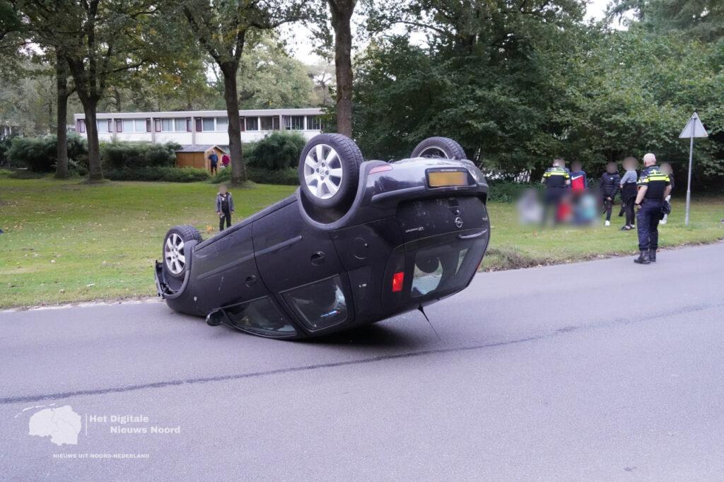 Een automobilist raakte door nog onbekende oorzaak een steen langs de weg, waarna het voertuig over de kop sloeg. De auto kwam uiteindelijk op het dak tot stilstand.