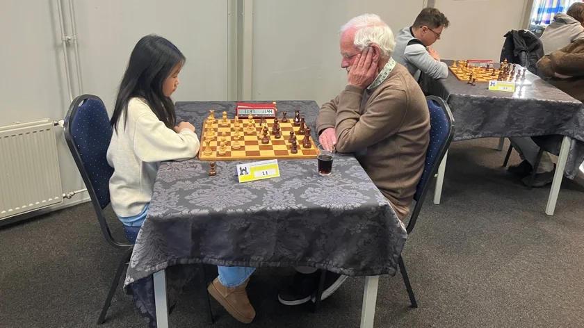 Op de foto is het 11-jarige jeugdtalent Jinchen Zhang van Schaakclub Het Witte Paard uit Haarlem te zien, in actie tegen de 78-jarige Gert Both, een ervaren en sterke speler van SC Sneek – een mooi voorbeeld van de veelzijdigheid en verbindende kracht van de schaaksport.